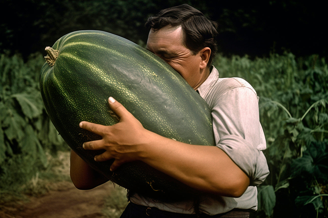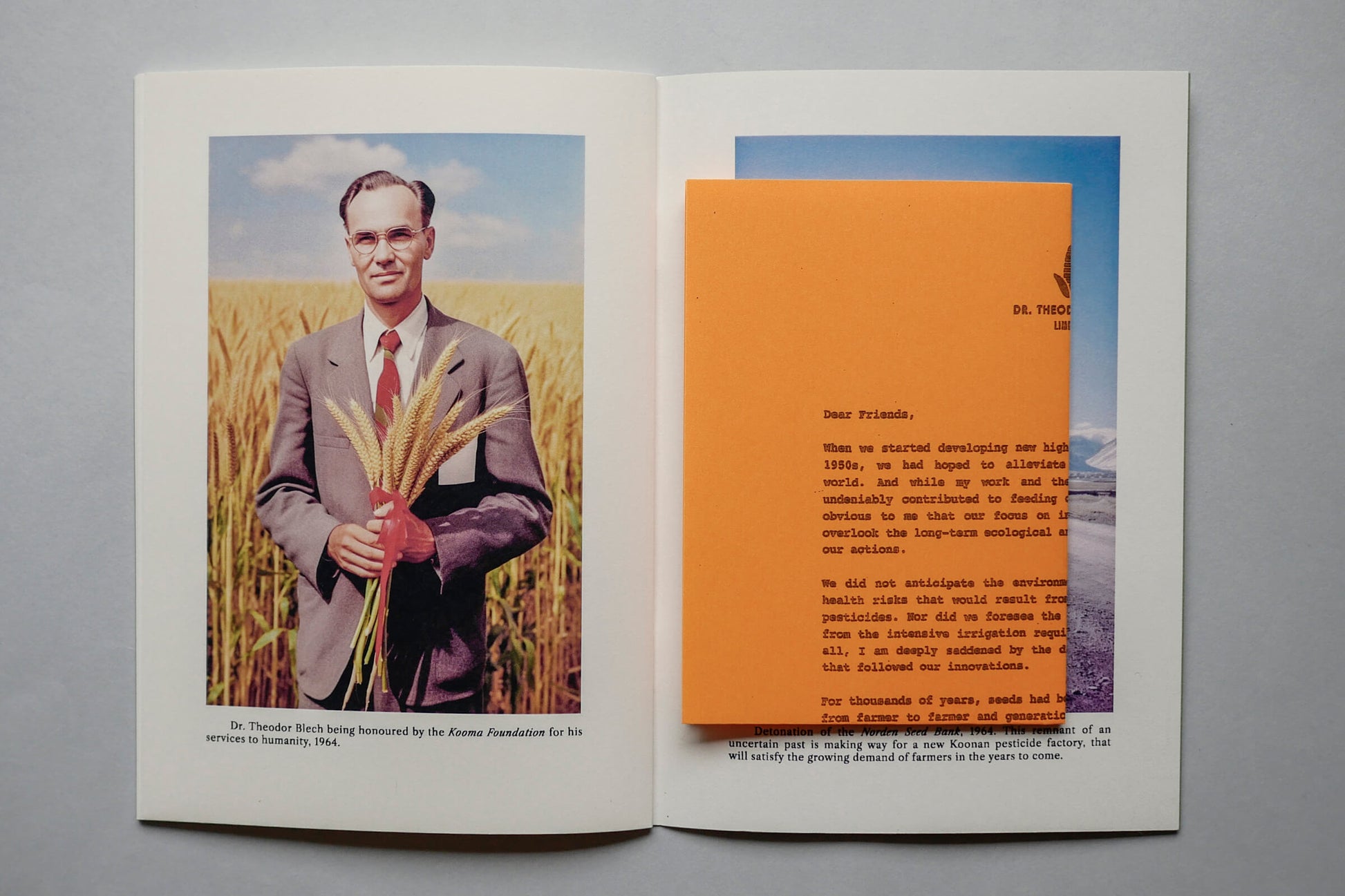 New Farmer appears to be a collection of documentary photographs published by an agribusiness in the 1960s to celebrate the success of the Green Revolution: genetic manipulation results in new crop varieties which result in bigger and better harvests. As the story unfolds however, there are cracks. The images hover just slightly beyond believability until finally turning absurd. They are not documentary photographs from the 1960s as the pamphlet suggests, but AI-generated images.